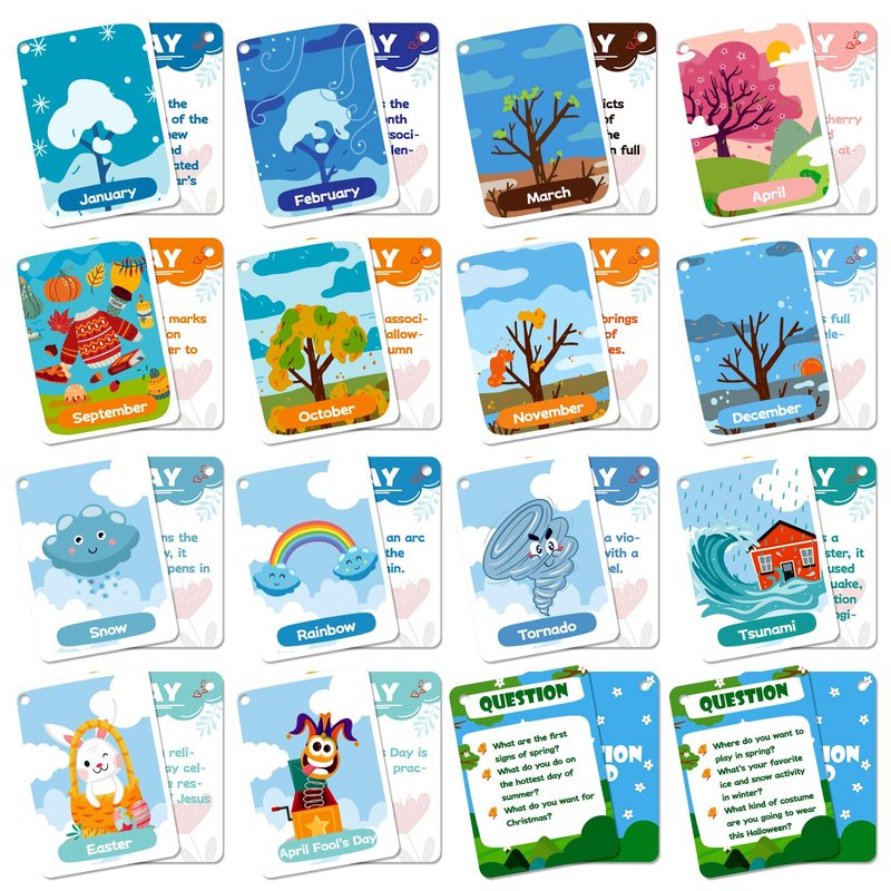 - 🍎【SEASON COGNITION FLASH CARDS】:There are 34 pieces of season cognitive flash cards with different colors in the package.The season learning flashcards set includes some common holidays, months of the year, seasons, and even natural phenomenon such as tornado and volcano.The back of each flashcard contains a description and explanation of the season.
