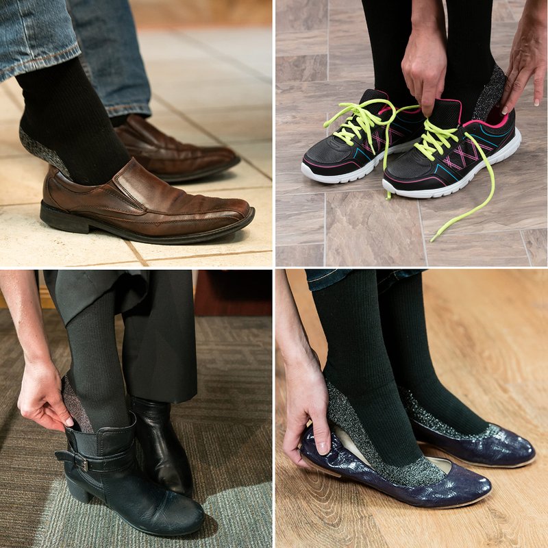 These are the compression socks men and women will love to wear during their workday. They feature woven aluminized fibers that use the same amazing science as the original 35 Below Socks and are concentrated in the toe and foot areas to keep feet warm. They also gently hug your legs to help with your circulation. This promotes blood flow and can help soothe swelling or discomfort from long days at work. Our compression socks are also the perfect travel companion! Wear them on the plane or in the car and you’ll be good to go without cramping until you reach your destination. Simply slide them on under your slacks and you’ll be ready to take on the day without discomfort.