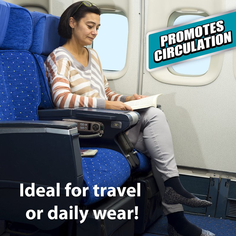 - TRAVEL COMPRESSION SOCKS: Sitting for long periods on an airplane or in a car can become very uncomfortable, and it can certainly take a toll on your feet and legs! These men’s and women’s circulation socks help minimize swelling and discomfort.