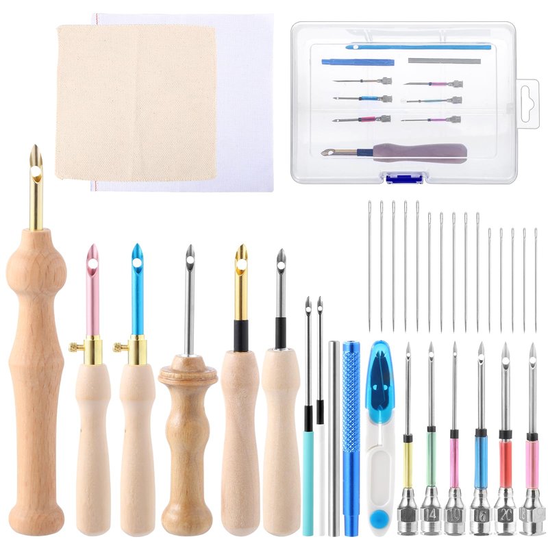SpecificationsPunch Needle Material: copper Quantity: 35 pcsFeatures1.Includes 6 pcs wooden handle punch needles (2 adjustable), 8 pcs poke needles, 2 pcs metal handles, 15 pcs large eye blunt needles (3 different lengths), 2 long needle threaders, 1 yarn scissors, 11.8*11.8 inches natural punch needle cloth, and a plastic organizer box.2.The diameter of wooden handle punch needle is 3.5mm, 5mm, the diameter of metal handle punch needle is,1mm, 1.2mm, 1.6mm, 1.8mm, 2mm, 2.5mm, 3mm, 3.5mm. Natural punch needle cloth is 11.8*11.8 inches. Large eye blunt needles length:5cm/6cm/7cm.3.The handle of punch needle embroidery kits is made of wood and stainless steel, the needle is made of copper. Smooth face and lightweight punch needle tool is easy to hold and use. Package Includes:35 Pcs Punch Needle Kit