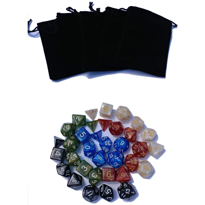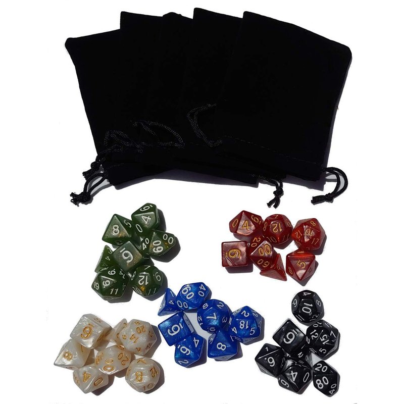 - Contains five standard sets of polyhedral dice. Each matching set contains a D4, D6, D8, D10, D12, D20, and a percentage die.