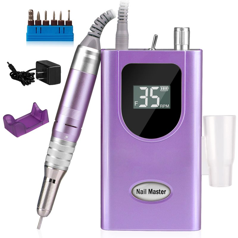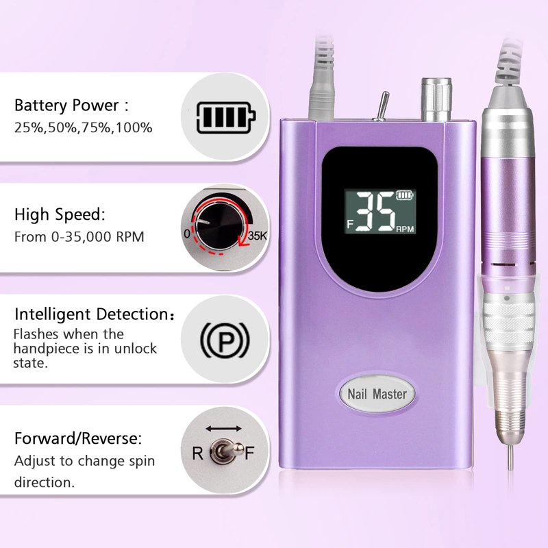 - Rechargeable and Cordless, Speed LCD Display and Battery indicator: Full charge takes about 1.5-2 hours, and the electric nail file can be cordless continuous use up to 10 hours. Equipped with LCD Display and battery indicator, which can show clearly the RPM when working and battery remaining capacity. Adjust FWD/REV button to change the spin direction.
