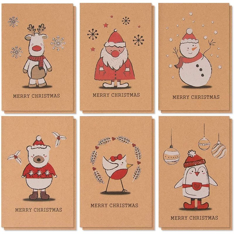 36 Pack Kraft Merry Christmas Greeting Cards with Envelopes, 6 Holiday Yuletide Character Designs (4 x 6 In)