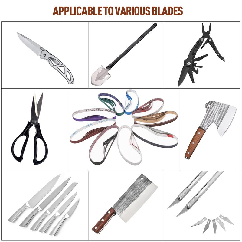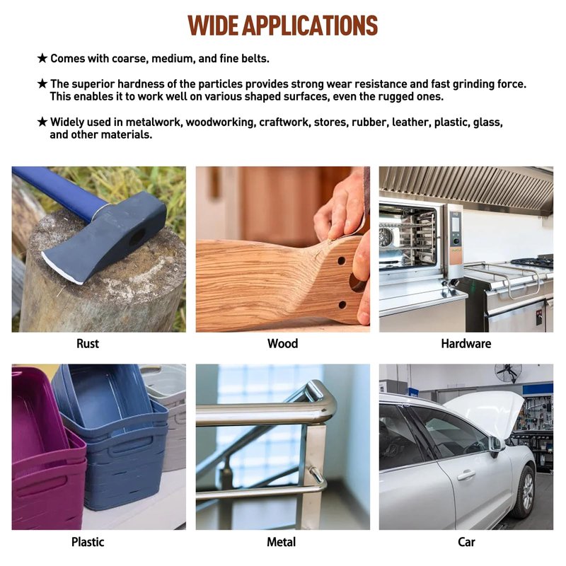 - 【Wide Application】These Different Grinding belt Set meet all your sharpening/polishing needs. Derusting, deburring, blade edge sharpening, welding spot grinding and polishing for metal, wood, fiberglass, rubber, plastic, stone, automotive, motorcycles, boats etc