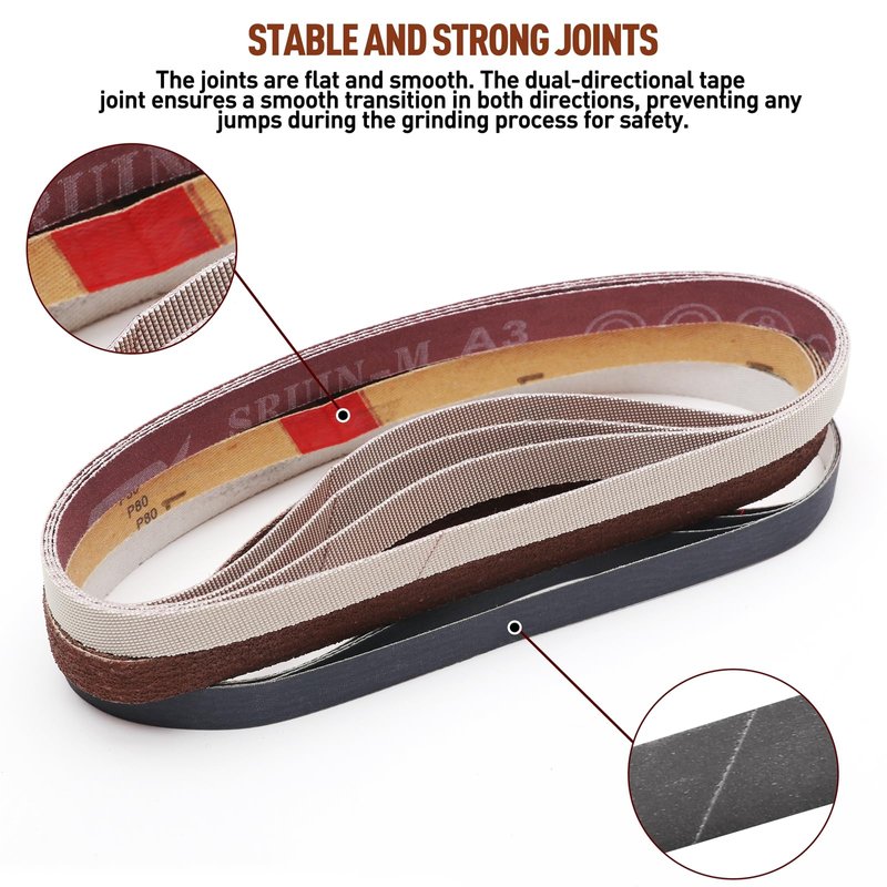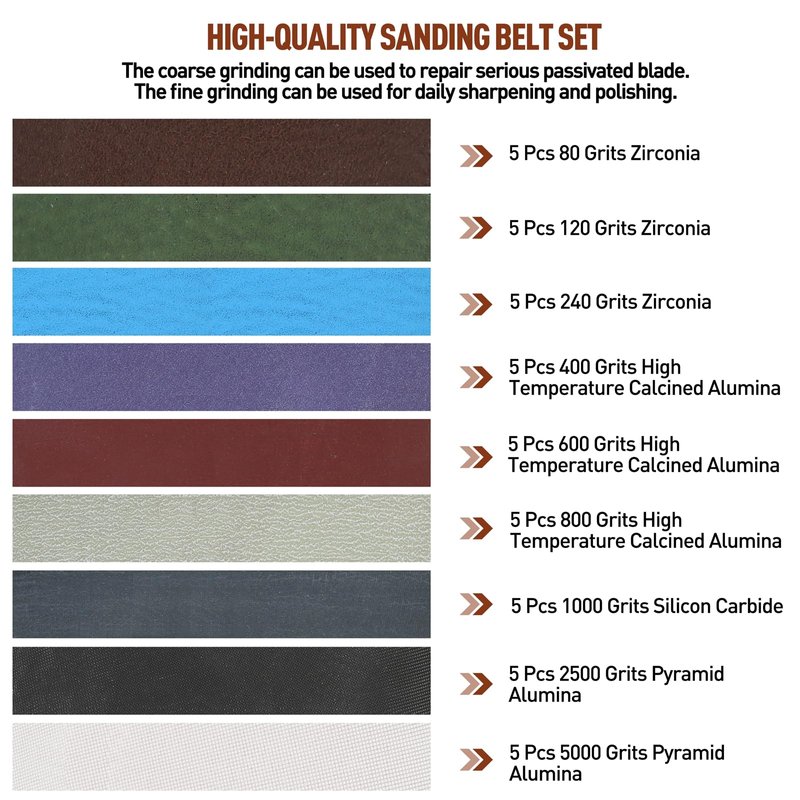 - 【Package Included】36 Packs 1/2" X 18" Sanding Belts: 4 pcs 80 Grits Zirconia belts, 4 pcs 120 Grits Zirconia belts, 4 pcs 240 Grits Zirconia belts, 4 pcs 400 Grits high temperature calcined Alumina belts, 4 pcs 600 Grits high temperature calcined Alumina belts, 4 pcs 800 Grits high temperature calcined Alumina belts, 4 pcs 1000 Grits Silicon Carbide belts, 4 pcs 2500 Grits pyramid Alumina belts, 4 pcs 5000 Grits pyramid Alumina belts.