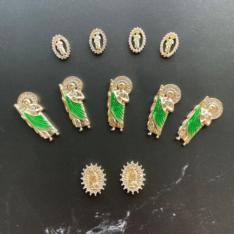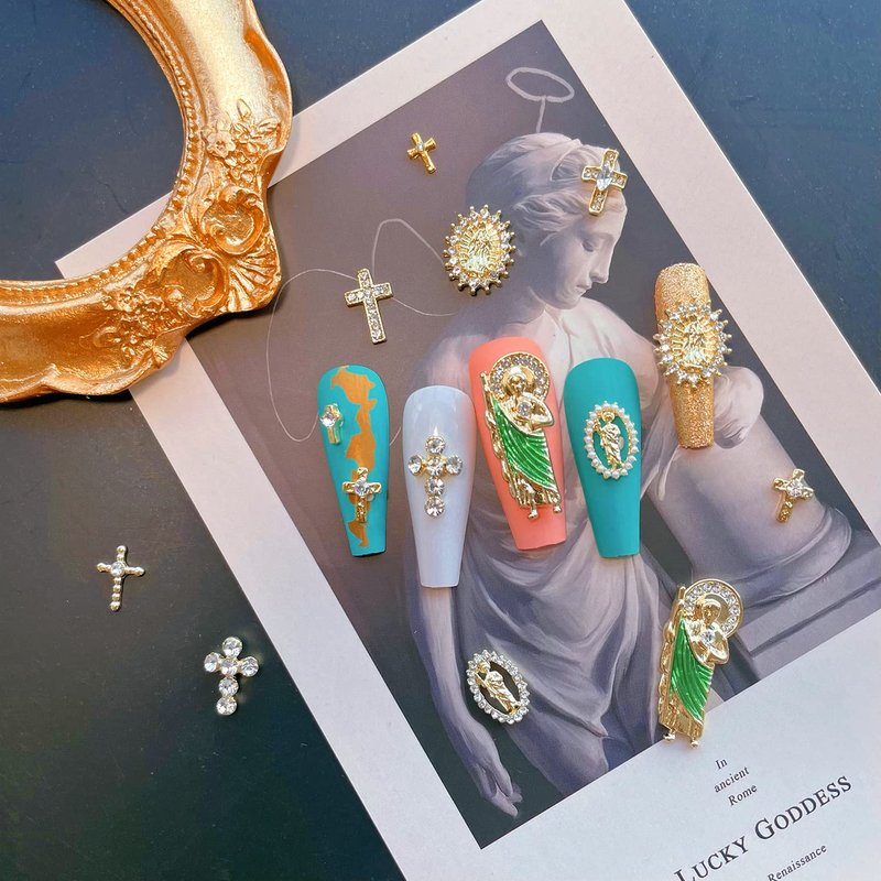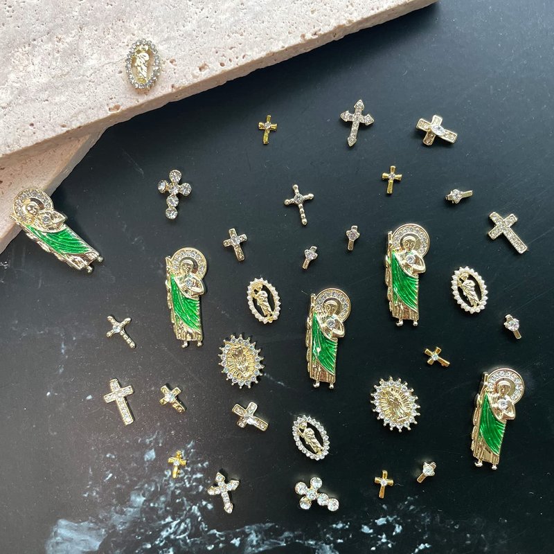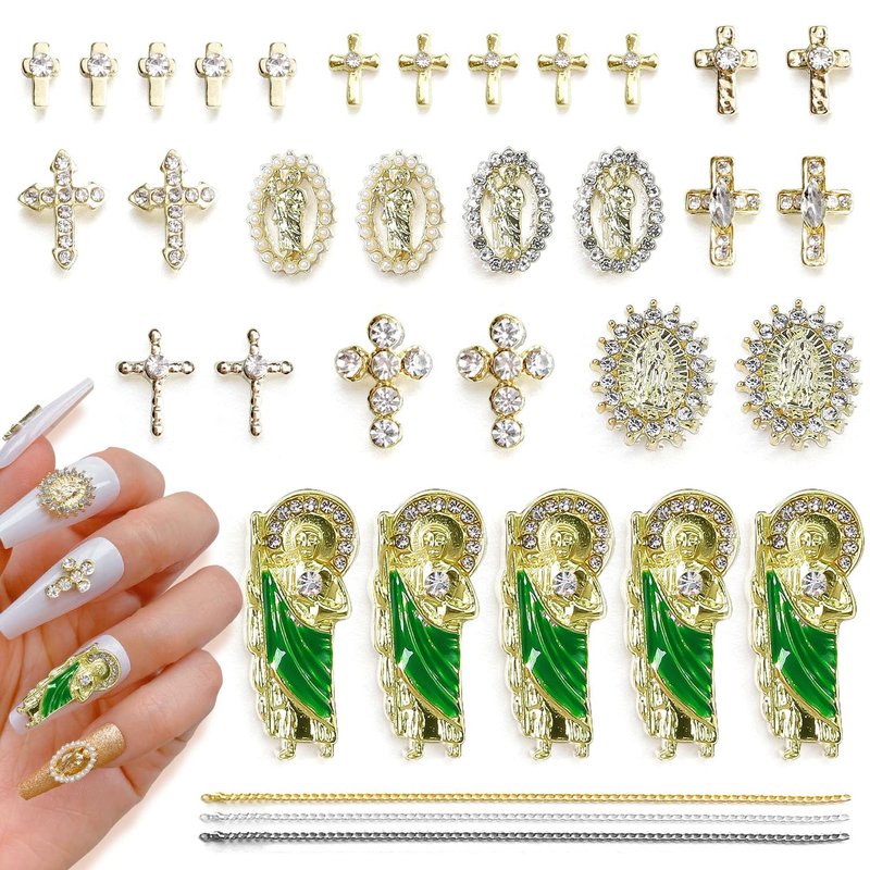 - 【Luxury Rhinestones Gold Nail Charms Set】11 Pcs 3D Nail Charms with san judas tadeo Virgin Mary shape, 22 Pcs cross nail charms, 3 Pcs versatile chains for your daily needs.exquisite and noble, make your nail to be charming.