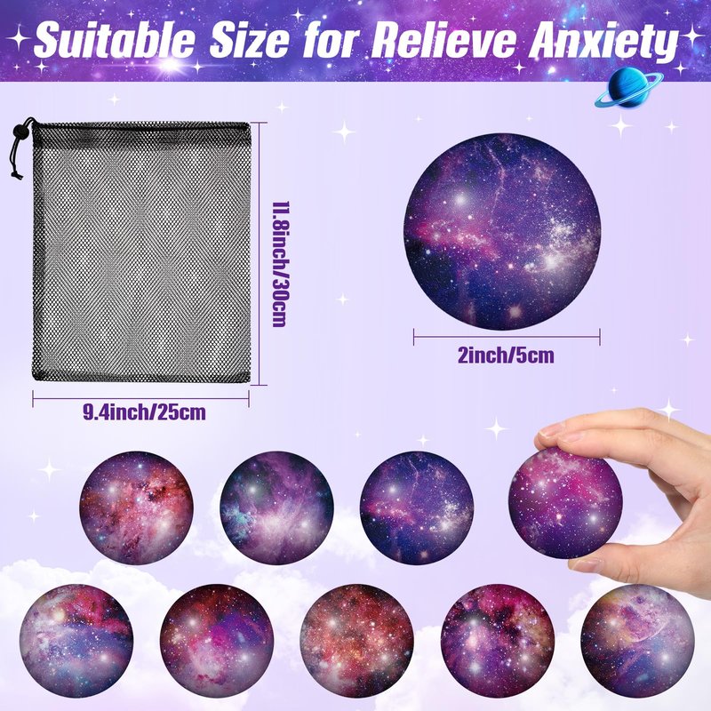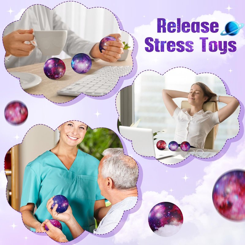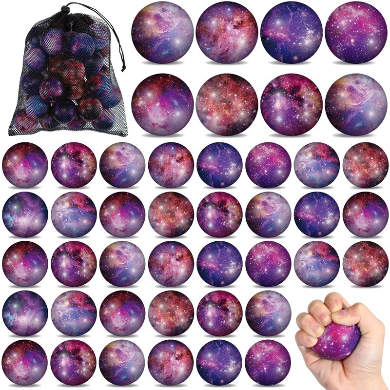 - Galaxy Stress Balls Bulk: you will get 36 pieces of galaxy stress balls in 9 styles, 1 black drawstring bag; These stress balls are printed in delicate galaxy prints, they are as charming as the universe, cute and attractive, which can help people focus, ease life's stresses, and keep the mood relaxed
