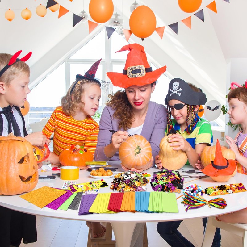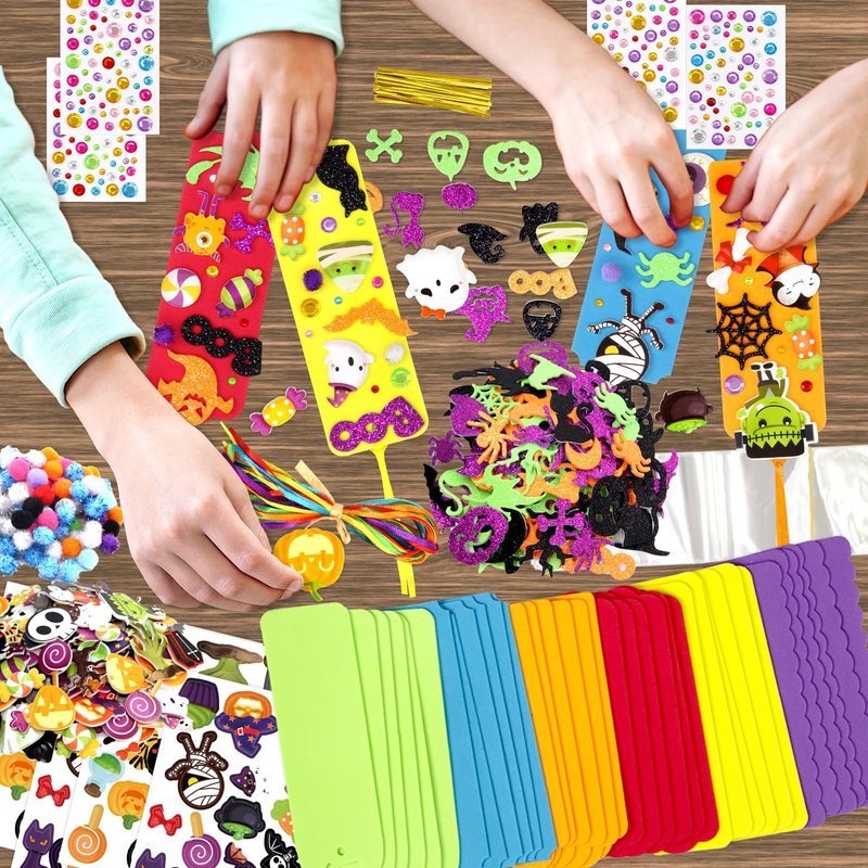 - Package Includes: 36 sets Halloween crafts for kids, including 36 foam bookmark bases in 6 designs, 144 Halloween foam stickers, 108 Halloween glitter foam stickers in 4 colors, 100 colorful pom-poms, 42 satin cords, 4 sheets rhinestone stickers, 40 plastic cellophane bags, 40 metallic twist ties, a roll of adhesive dots, 36 Halloween gift tag stickers in 6 designs.