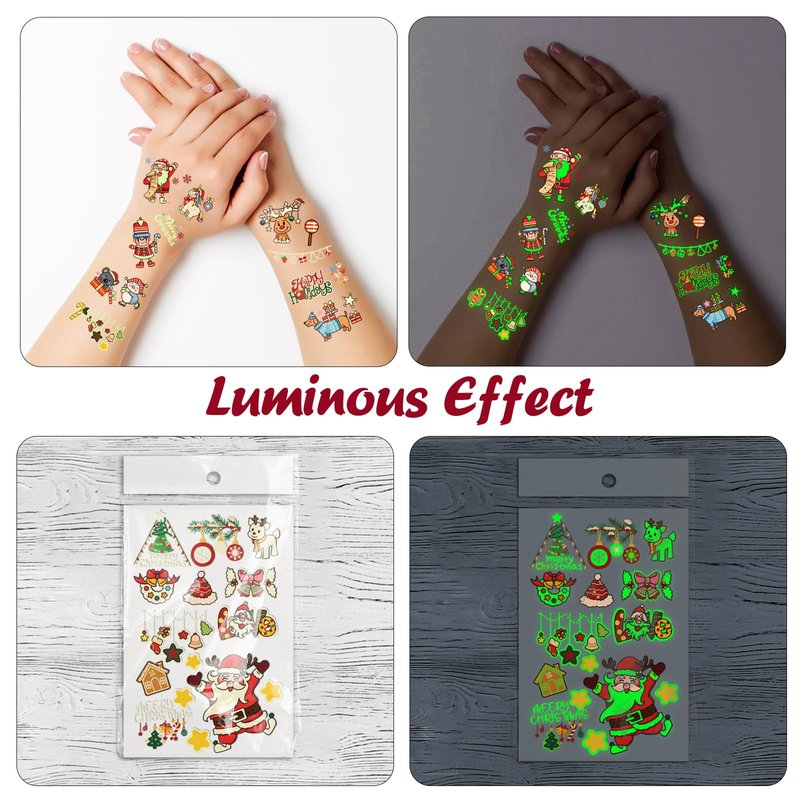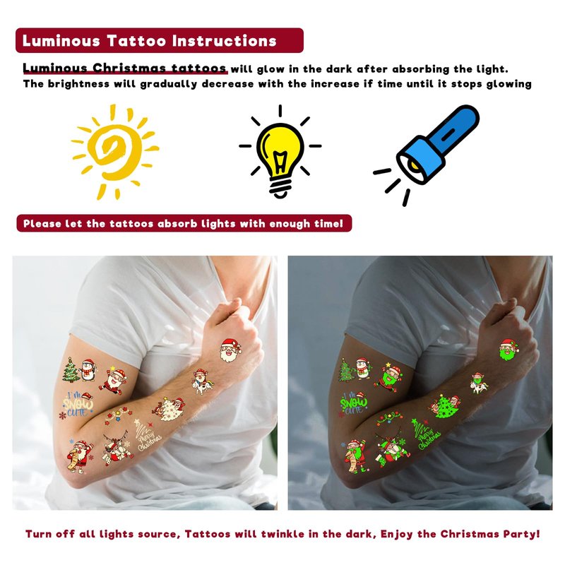 - 【Safe for Kids Fake Tattoos】Glowing fake Christmas tattoos are waterproof, non-toxic and non-allergic. Safe for all skin and all ages over 3 years old. It can last about 3-7 days. The kids can wear to have fun without worries