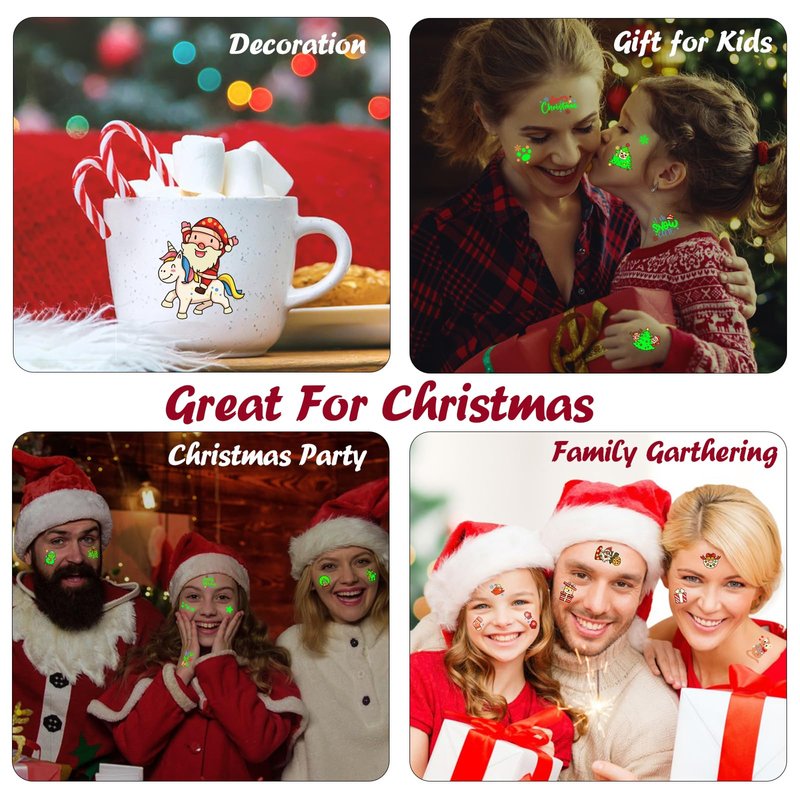 - 【Show your Christmas Spirit 】Glow theme stocking stuffers for kids temporary tattoos you can give your entire table a Christmas atmosphere? You can use our Christmas temporary tattoos to decorate plates, glasses and candles. Get in the holiday spirit with our Christmas Tiny Tats