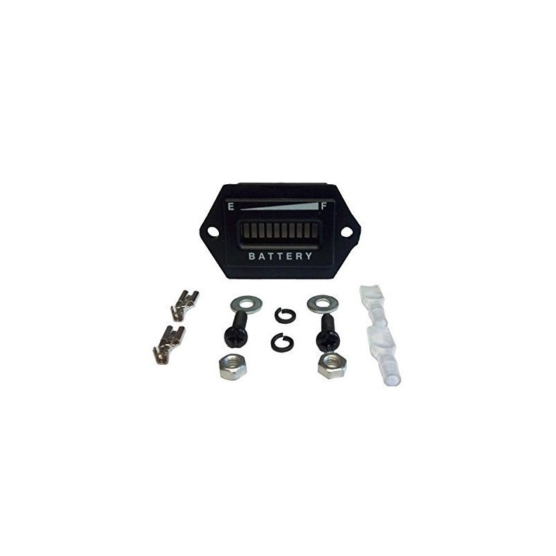 Horizontal battery charge indicator. For all 36 volt golf carts. Two pre-drilled holes for easy installation. Hardware included. Wiring NOT included.