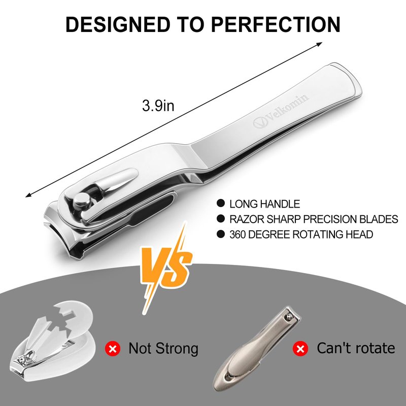 VELKOMIN 360° Nail Clippers for Seniors. Your search for the perfect nail clippers is finally over. This 440c stainless steel nail clipper is tempered with precise blades and a hand-sharpened cutting edge to trim nails effortlessly equally. The swivel angle works in many different arrangements, making it easy to cut toenails and fingernails. The angled head is not loose so it is totally safe and won't move when cutting. The more extended handle helps make trimming nails effortless too.