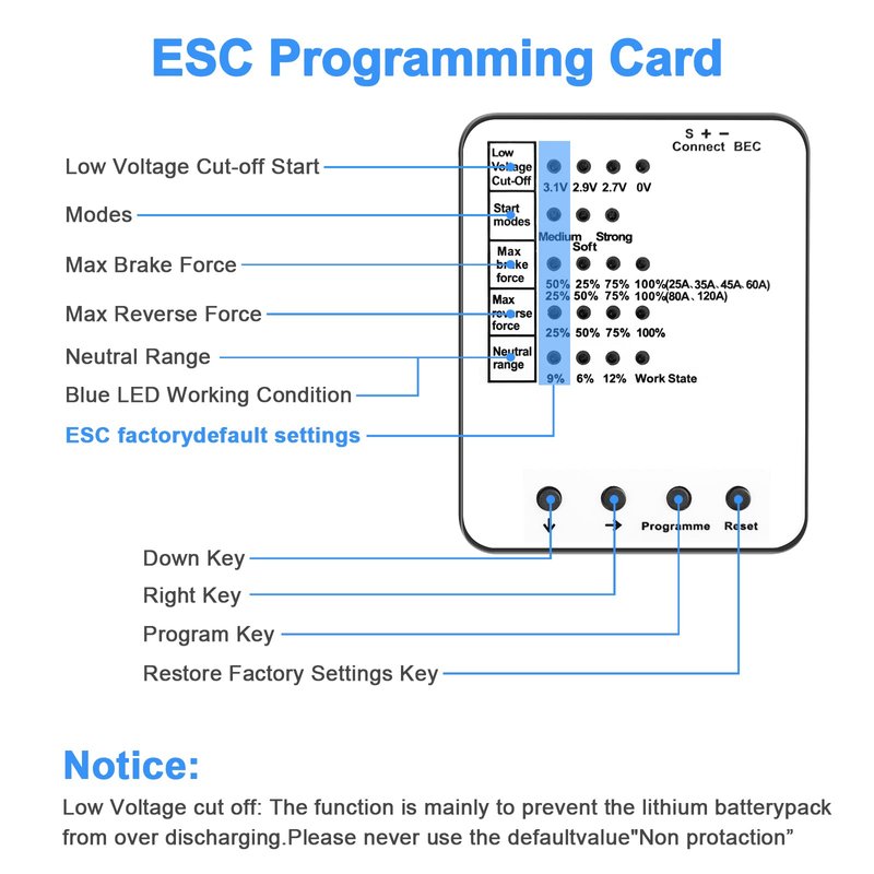 - ✅The ESC(electronic speed controller) programming card suitable for 25A 35A 45A 60A 80A 120A Brushless ESC, compatible with of kind of 1:8,1:10 scale rc car, bring different speed control experience for you.