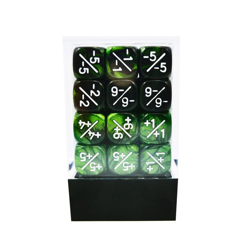 - 36pcs 12MM D6 set comes with 36 pieces of dice counters, including 18 pieces marble green positive dice counter and 18 pieces gemini green&black negative dice counters;