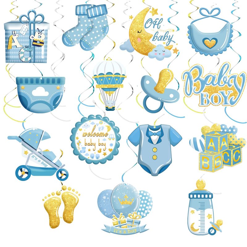 - CUTE BOYS THEME PARTY DECORATION SWIRLS:These blue baby shower party ceiling hanging streamers decorations kit composed of uniforms,strollers,bibs, gift boxes, feeding bottles,balloon,foot and so on.15 various patterns of cute girls hanging streamers with different hanging lengths,sizes and shapes,can decorate the baby shower party well and impresses your guests.