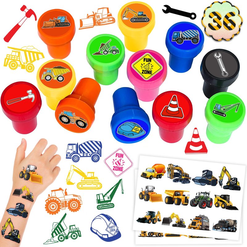 36PCS Construction Party Favors 24 Tattoos Sticker 12 Stamp Set - Ideal Vehicle Excavator Bulldozer Themed Birthday Decor Supplies Goodie Bag Classroom Gifts Cute Rewards for Girls, Baby Shower