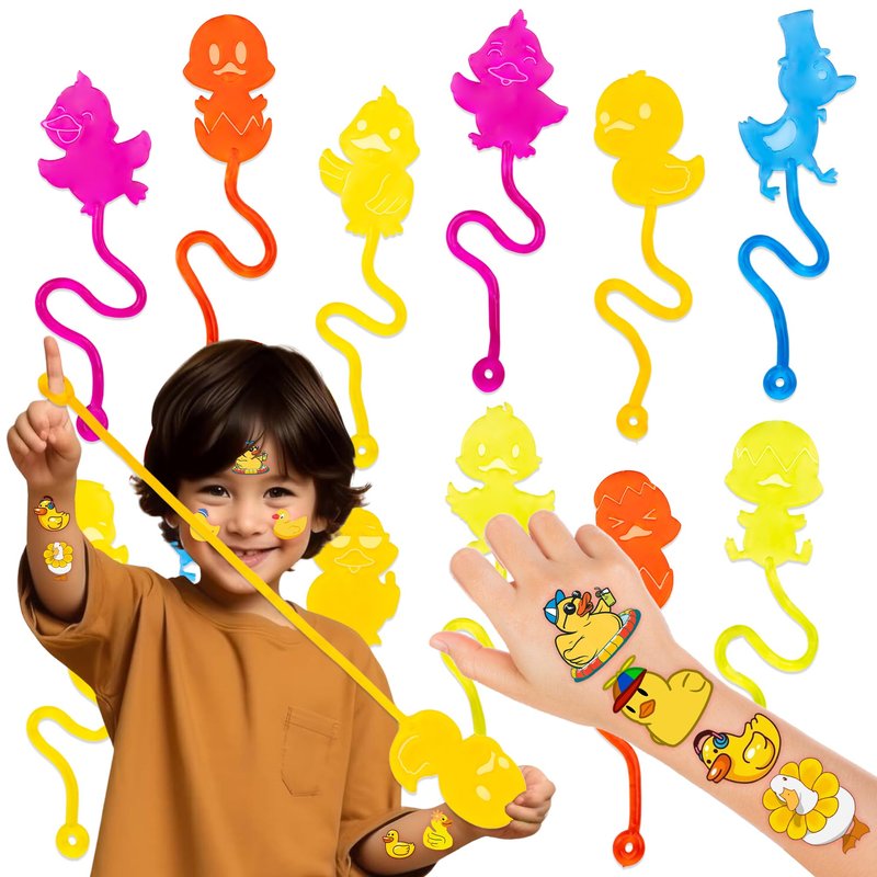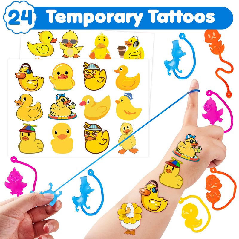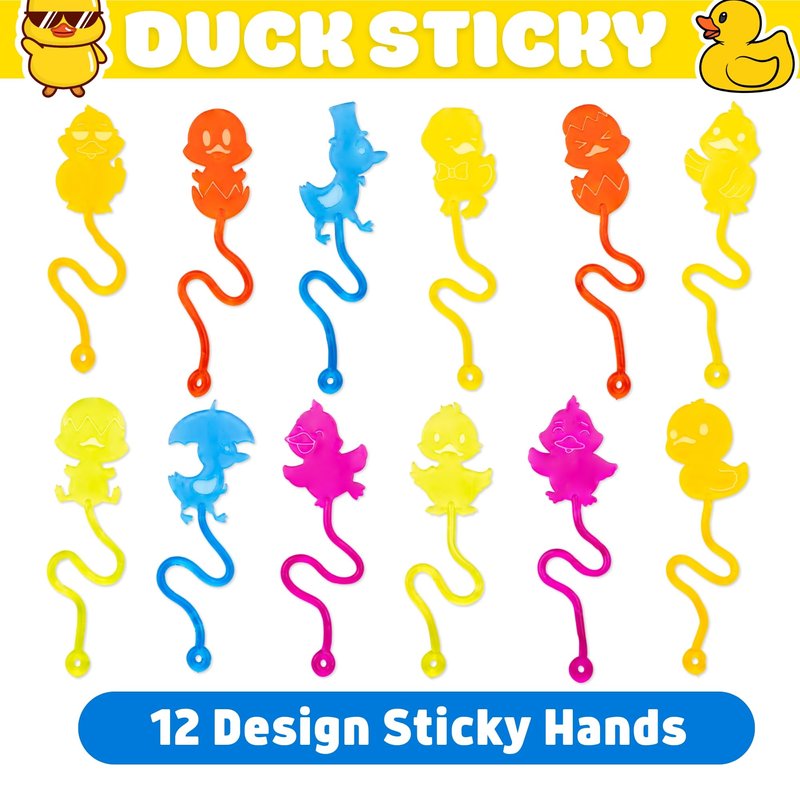 - đăRUBBER DUCK STICKY HANDS KIDS PARTY FAVORSă: 12 PCS Rubber Duck Sticky Hand Fidget Toys and 24 PCS Temporary Tattoos are perfect party favors for kids aged 4-12. Made of non-toxic and child-safe material, BPA-free, and durable for long-time use. Ideal for birthday party favors, goodie bags, and toddler party favors for kids aged 4-8. These rainbow-colored toys and fun tattoos are also great for school events.