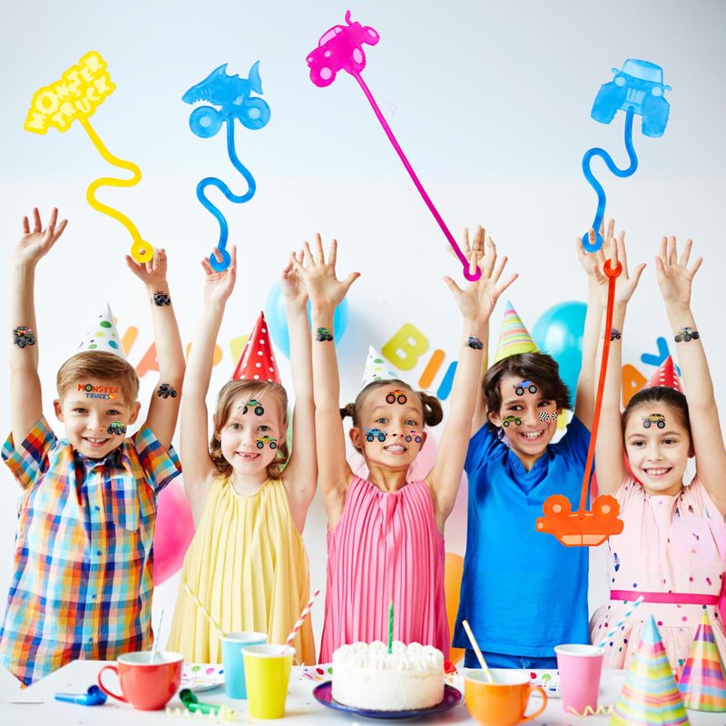 - 🎉【MONSTER TRUCK STICKY HANDS KIDS PARTY FAVORS】: 12 PCS Monster Truck Sticky Hand Fidget Toys and 24 PCS Temporary Tattoos are perfect party favors for kids aged 4-12. Made of non-toxic and child-safe material, BPA-free, and durable for long-time use. Ideal for birthday party favors, goodie bags, and toddler party favors for kids aged 4-8. These rainbow-colored toys and fun tattoos are also great for school events.