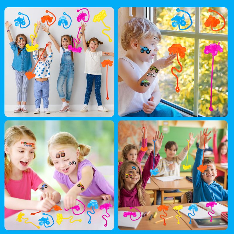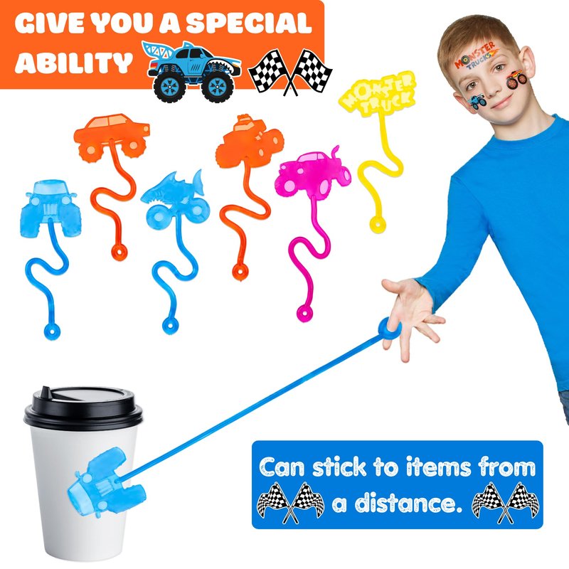 - 🏆【TREASURE BOX TOYS FOR CLASSROOM PRIZES】: Monster Truck Sticky Hands and Temporary Tattoos are perfect for classroom supplies, back-to-school prizes, and treasure box rewards. Ideal for student prizes, classroom rewards, birthday party favors, and mini pinata toys for kids aged 4-8.