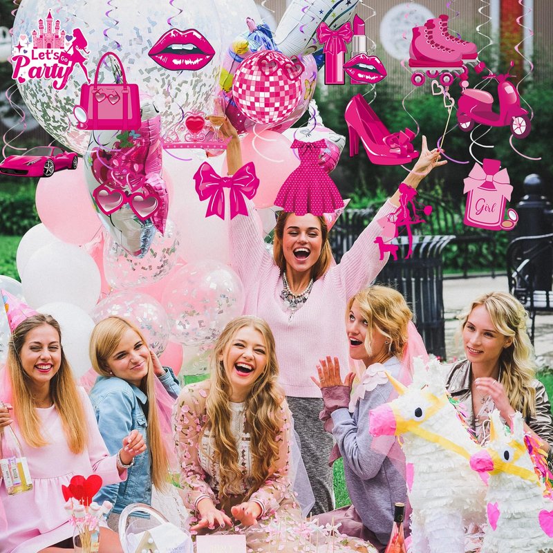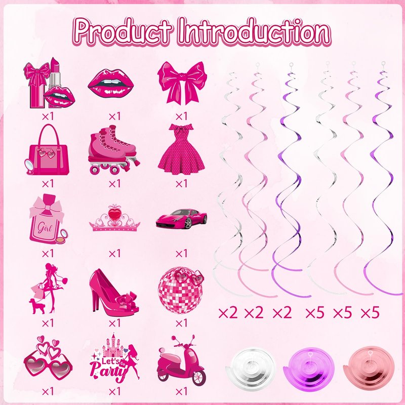 - UNIQUE DESIGN:These Hot pink birthday party hanging swirls decorations kit composed of big red lips,disco ball, glasses,dress,roller skates,sports car and so on,It will be a great decoration for your Bachelorette party, 15 various patterns of princess with different hanging lengths,sizes and shapes.Having a satisfying party for you and your friends