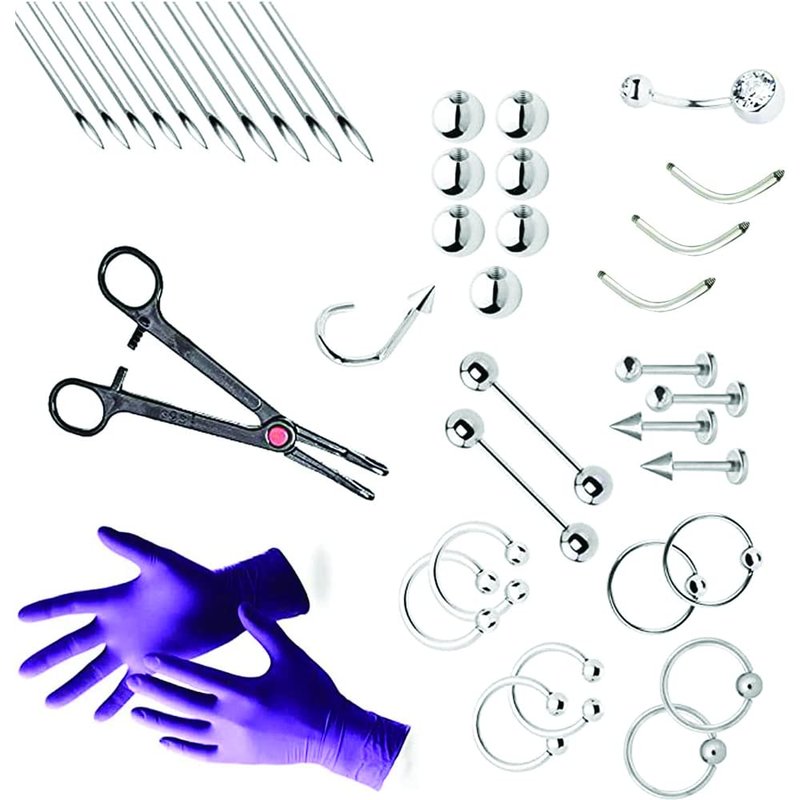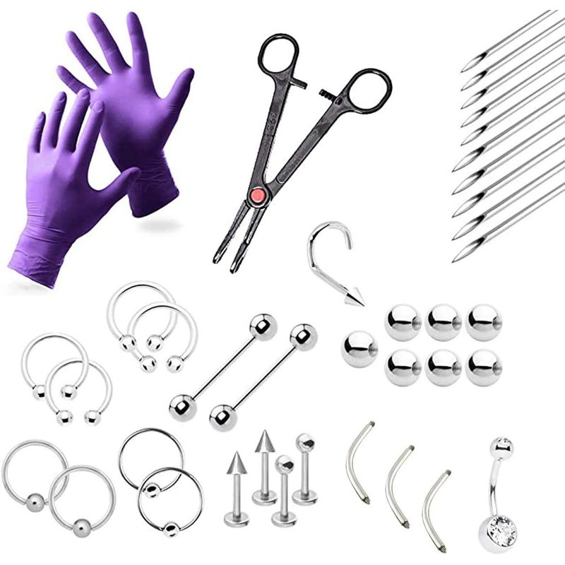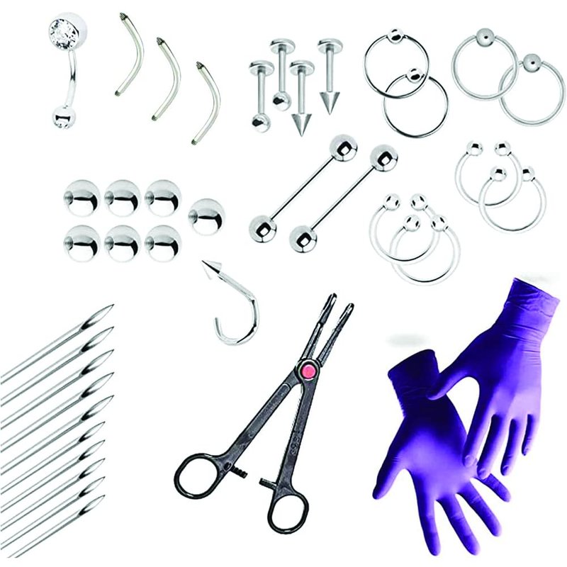 38-Piece Professional Piercing Kit - Lip, Nipple, Replacement Shaft Belly, Eyebrow, Tongue, Ear Piercing Jewelry - Needles, Gloves and Tools Included