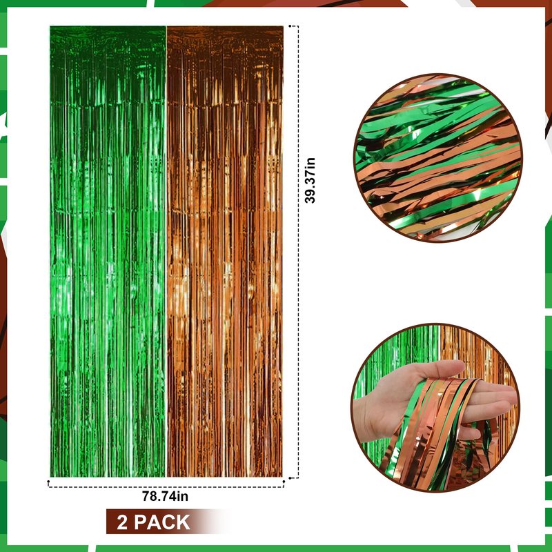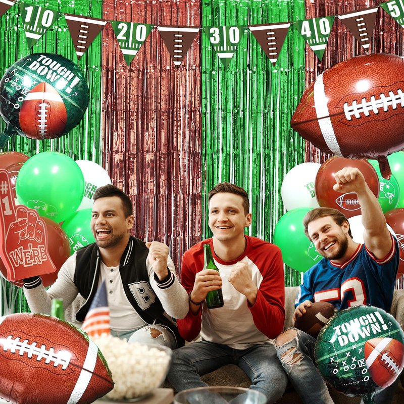 - Inside the package: 2pcs green brown fringe curtains, 2 football-shaped aluminum foil balloons, 2 18-inch "Touch Down" green aluminum foil balloons, 8 green balloons, 8 "Touch Down" white balloons, 8 red 50 balloons, 8 burgundy balloons, and 1 set of football triangle banner.