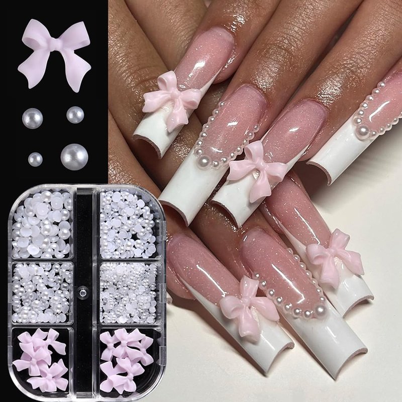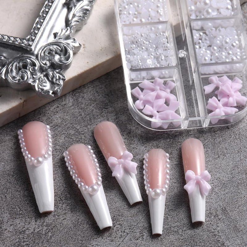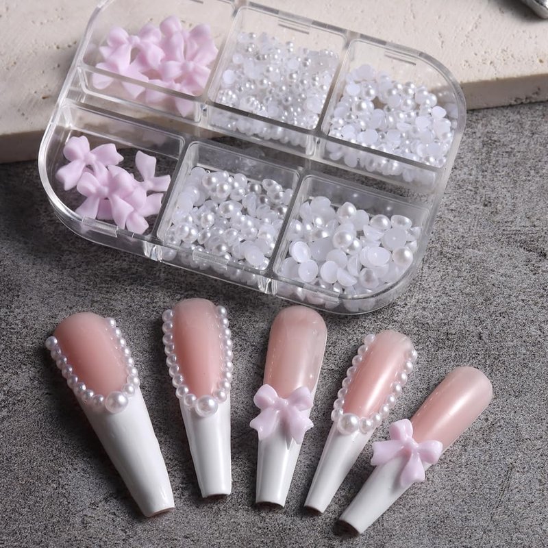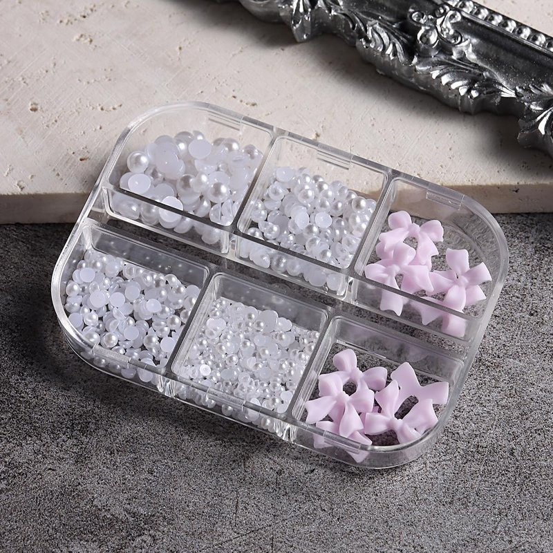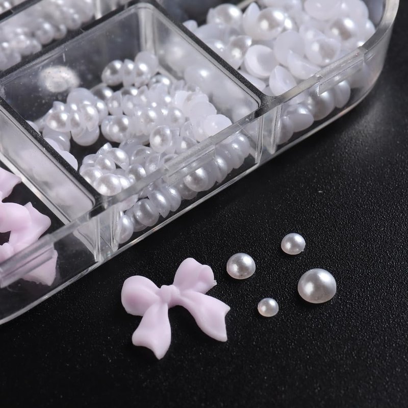 - 【You Will Get】 6 grids/box nail charms, which contains resin bow and 4 sizes of half round pearls.