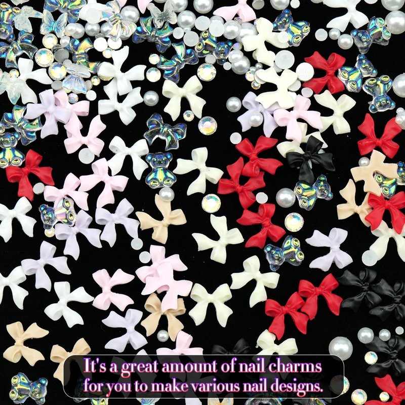 - ★Various Colors: These nail bow charms are in 8 colors: White, Pink, Yellow, Red, Black, Purple, Brown. And a grid of white nail pearls comes and mix sizes nail crystals rhinestones. Such a lot of choices to design your special nail art style.