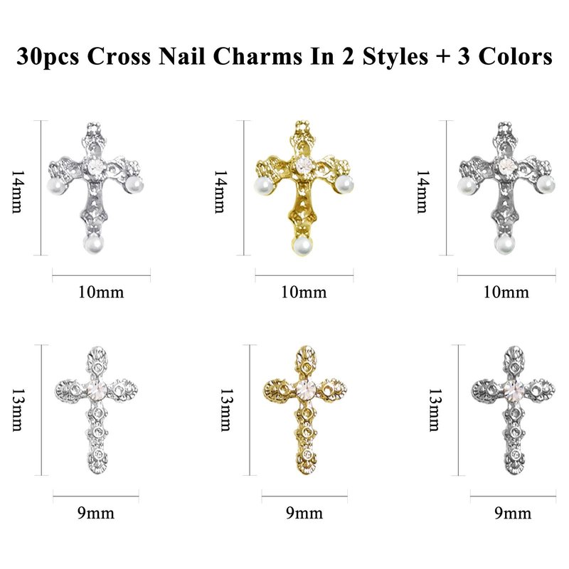 - 【Cross Nail Charms Kit】You will get 30 pieces 3D Luxury Cross nail art charms in 2 different styles and 3 color, 6 types in total, 5pcs of each type. Our nail decorations have sufficient quantity and different styles, which can meet all your needs for DIY nail art, make your nail to be charming!