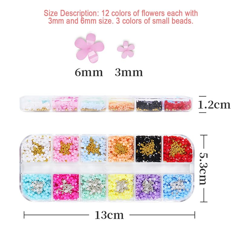 - You will receive a 12 compartment box of floral nail art decorations in 12 colors each with more than one size 3mm and 6mm.