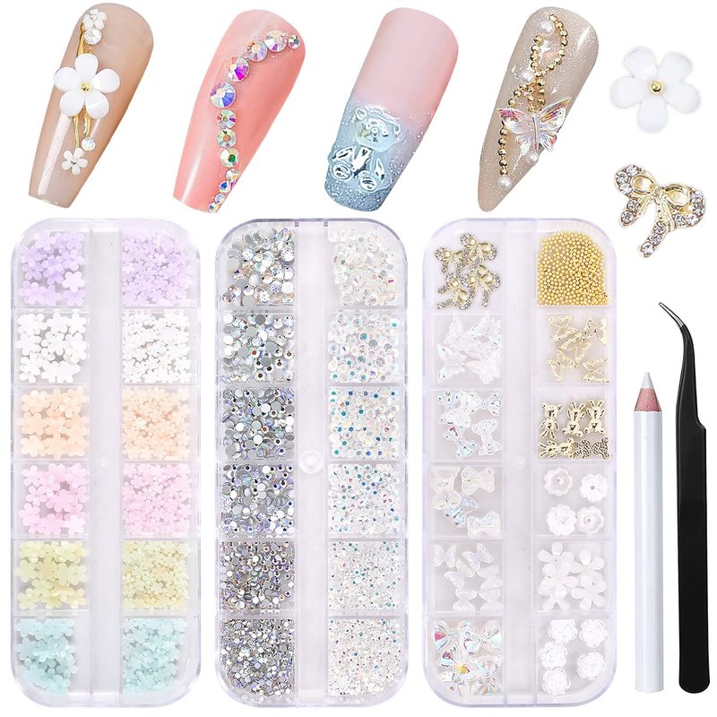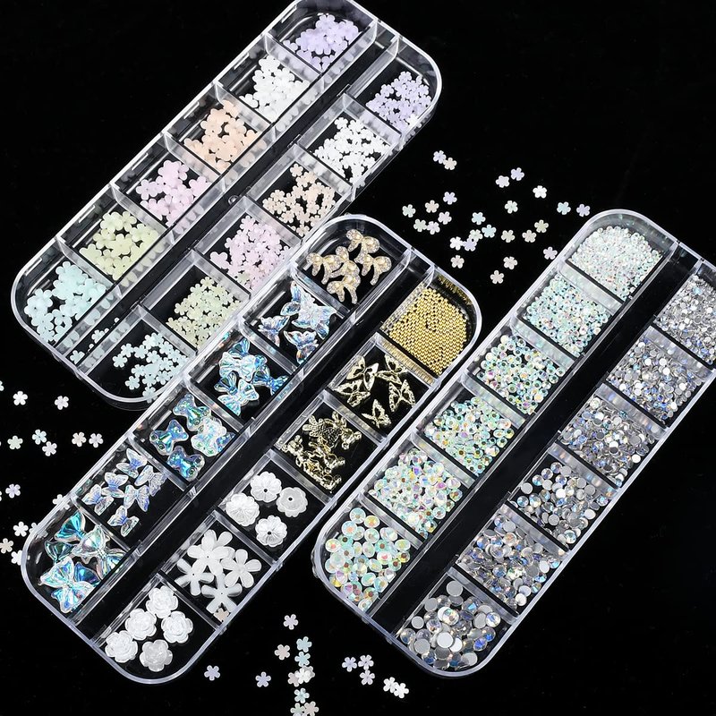 - 【Pretty and delicate kit】: You will get 3 boxes nail decoration. Box-1 are 3D nail charms, including flower butterfly bear bow metal nail charms nail charms, total in 200pcs. Box-2 are nail rhinestones set, including 12 grids AB crystal nail rhinestones in 6 size , Box-3 are 12 grids color flowers nail charms in 2 size.