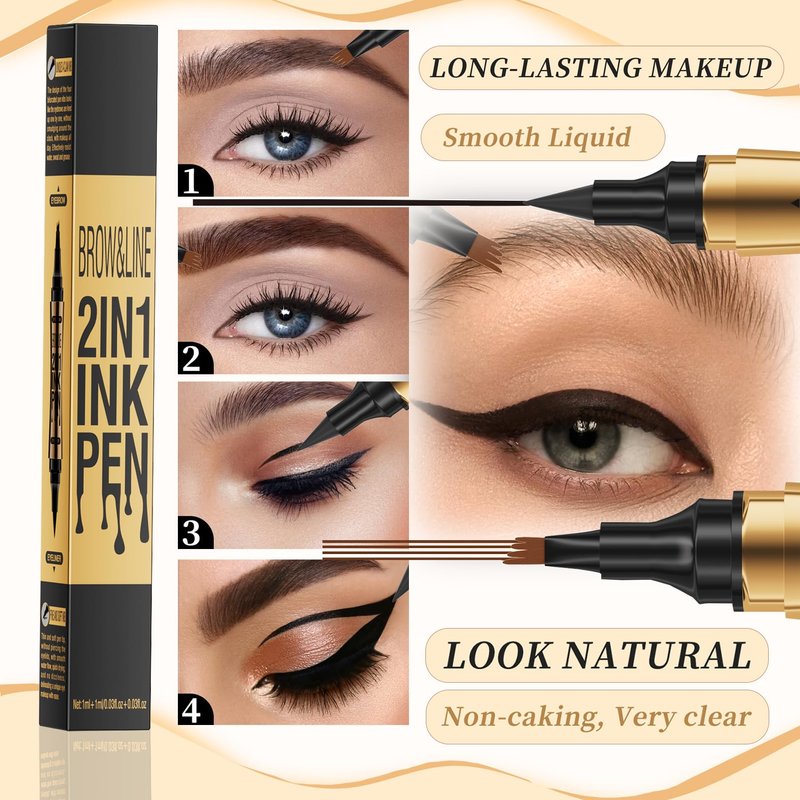 3D Four-Tip Eyebrow Pen & Eyeliner Duo - Waterproof, Long-Lasting, Smudge-Proof, Easy to Use for Perfect Brows and Defined Eyes - Light Brown Eyebrow Pencil & Black Eyeliner