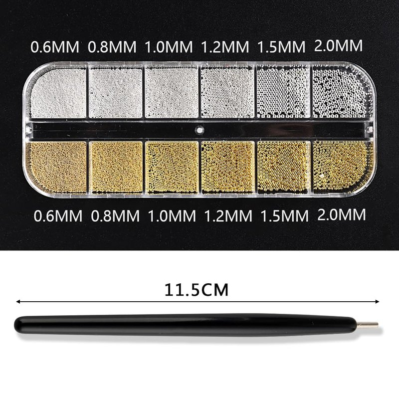- 【You Will Get】12 grids/box nail art steel caviar beads and 1 piece of magnetic pen for steel ball suction. The steel balls set includes 2 colors, gold and silver, each color has 6 different sizes: 0.6mm/0.8mm/1.0mm/1.2mm/1.5mm/2.0mm.