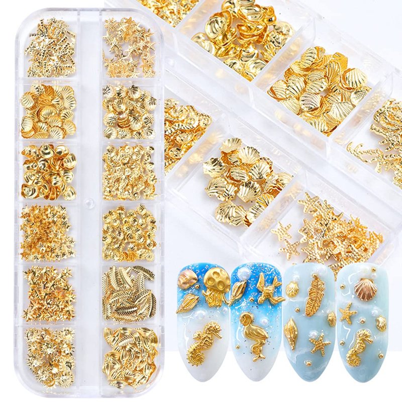 3D Nail Art Metal Decals 12 Shapes Holographic Nail Glitters Sequins Gold Nail Art Supplies Flakes Nail Art Decorations Kit Shell Seahorse Leaf Starfish Nail Charms Sparkles for Acrylic Nails Designs