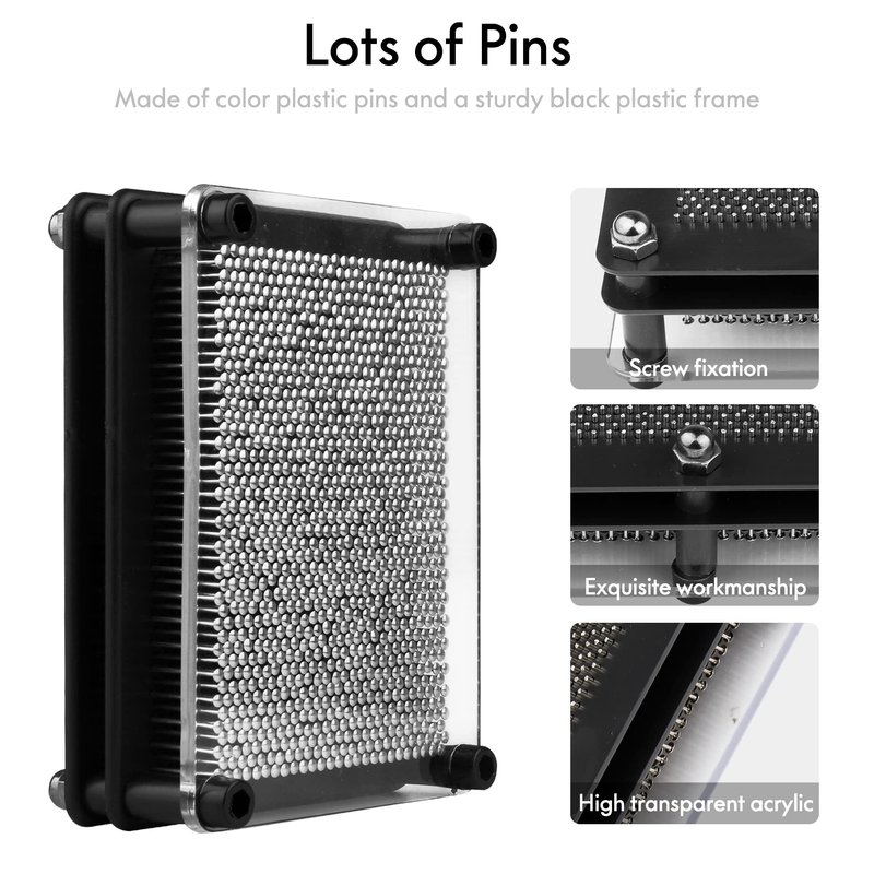 - Material: Pin art toy made of metal pins and black plastic frame with clear plastic front.