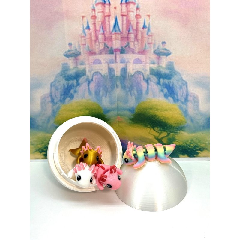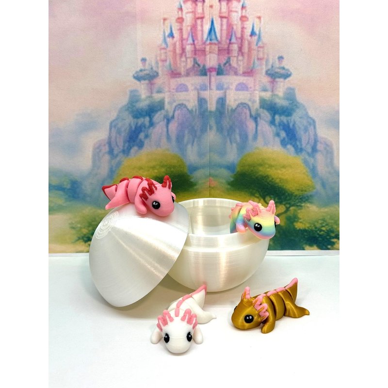 Introducing the MULTI COLOR/ASSORTED COLORS 4 pcs. Mini Axolotl with Egg, Your Articulated 3D-Printed Pal! Meticulously crafted with an eye for detail, this interactive desk accessory is not just a source of entertainment, it's also a stress-relieving toy and a chic decor piece for any space. Get ready for a unique experience with these 4 cuties, they are available for purchase with its very own Egg with Case, offering a perfect spot to conceal tiny treasures or partake in a delightful game of peek-a-boo! ------- Small Components Advisory: ------- Please be mindful that this product may contain small components and may not be suitable for very young children. Due to the nature of 3D printing, there is a potential for small components to detach if handled aggressively or dropped. Please be aware that 3D printed objects may exhibit minor imperfections like layer lines, inherent to the printing process. While we strive for the highest quality, these imperfections contribute to the distinctive character of each piece, making each raccoon uniquely crafted for you. The available color options are illustrated in the provided photos. Keep in mind that variations in color may arise from discrepancies in filament production and the characteristics of your monitor or screen. Additionally, the use of multi-colored filament rolls can influence color distribution in the prints. ------- Licensing Information: ------- Authorized Design: NOHo3D holds the official authorization for the production of this exquisite design created by Zou3D. Less