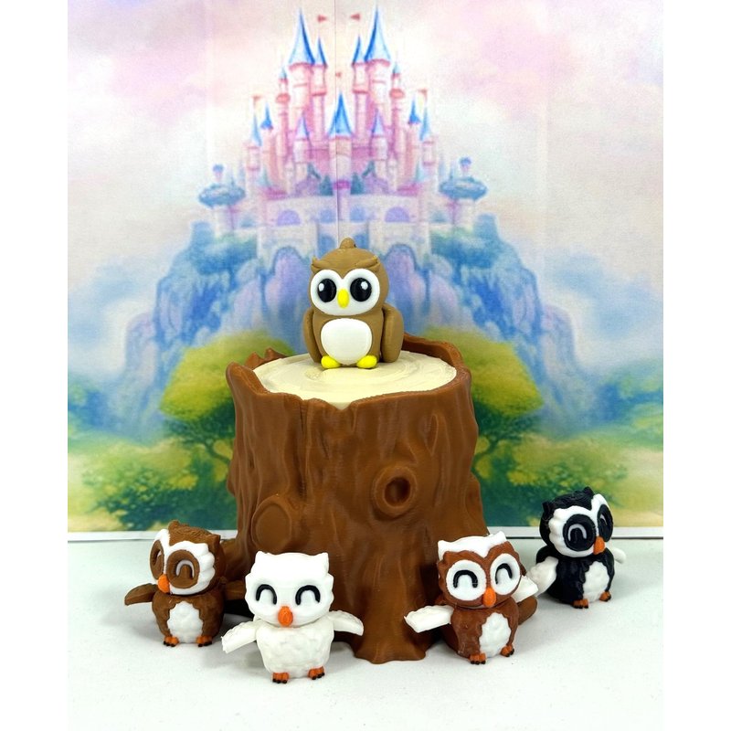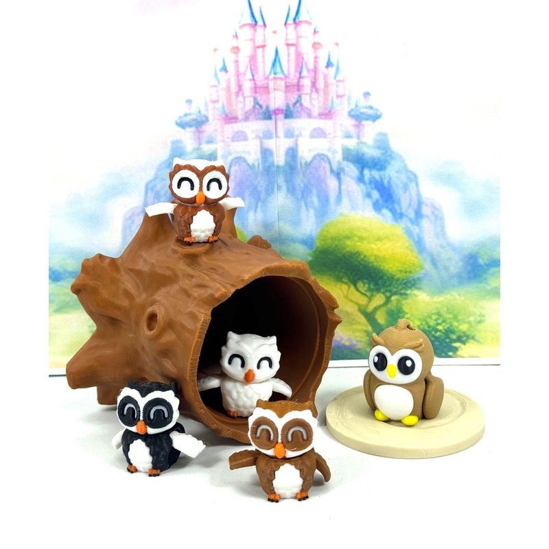 Introducing our 3D Printed ARTICULATED Mini Owls with Tree Stump. Each SMALL mini Axolotl measures 0.75" tall with movable head and wings, the biggest OWL does not have a moving head, but wings are moving. These 5 pcs posable mini Owls are meticulously crafted with an eye for detail, this interactive desk accessory is not just a source of entertainment, it's also a stress-relieving toy and a chic decor piece for any space. ------- Small Components Advisory: ------- Please be mindful that this product may contain small components and may not be suitable for very young children. Due to the nature of 3D printing, there is a potential for small components to detach if handled aggressively or dropped. Please be aware that 3D printed objects may exhibit minor imperfections like layer lines, inherent to the printing process. While we strive for the highest quality, these imperfections contribute to the distinctive character of each piece, making each Owl uniquely crafted for you. The available color options are illustrated in the provided photos. Keep in mind that variations in color may arise from discrepancies in filament production and the characteristics of your monitor or screen. Additionally, the use of multi-colored filament rolls can influence color distribution in the prints. ------- Licensing Information: ------- Authorized Design: NOHo3D holds the official authorization for the production of this exquisite design created by Zou3D designs.
