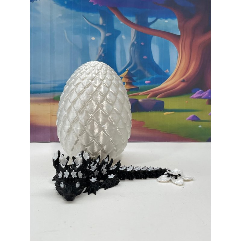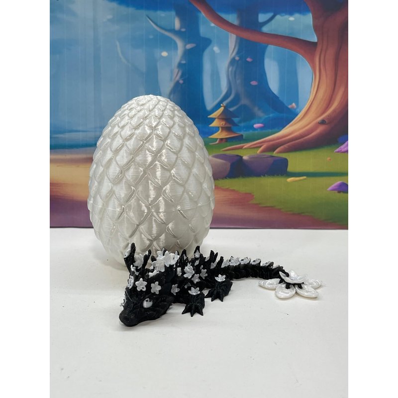 3D Printed enchanting Articulated Dragon - a mystical creature that brings a touch of fantasy to your world. Unveil the mystery of the Scaled silky White Dragon Egg and this Black and White Cherry Blossom Baby Dragon ( measures 6" long) a captivating fusion of elegance and fantasy. Encased within a meticulously designed crystal egg, this tiny dragon reveals itself with a symphony of colors - a testament to its magical heritage. ------- Small Components Advisory: ------- Please note that this product may contain small components and might not be suitable for very young children. Given the characteristics of 3D printing, there is a potential for small components to detach if handled aggressively or dropped. Therefore, we advise against allowing younger children to interact with the dragon. Please consider that 3D printed objects might include minor imperfections such as layer lines. These are a natural and inherent aspect of the printing process. We strive to produce the highest quality items, and these imperfections contribute to the unique character of each piece. Recall the unique creation of each dragon, crafted exclusively for you. The color selections available are depicted in the provided photos. Please be aware that variations in color may occur due to discrepancies in filament production and the characteristics of the monitor or screen you are utilizing to view the listing. Additionally, the arrangement of prints using multi-colored filament rolls can influence color distribution. ------- Licensing Information: ------- Authorized Design: NOHo3D holds the official authorization for the production of this exquisite design created by CinderWing3D.