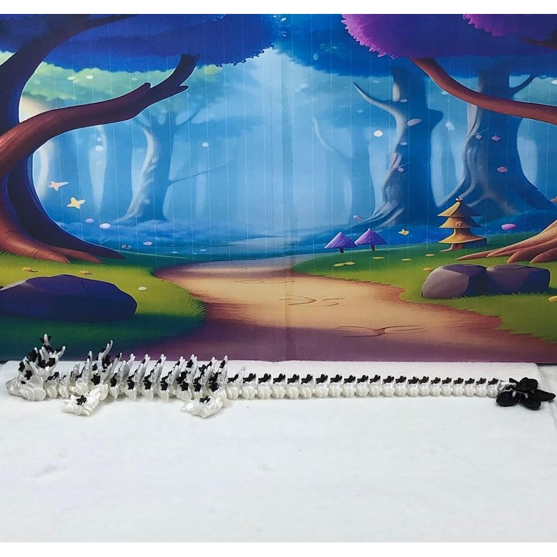 3D Printed enchanting Articulated Cherry Blossom Dragon - a mystical creature that brings a touch of fantasy to your world. Unveil the mystery of this White and Black Cherry Blossom Dragon ( measures 12" long) a captivating fusion of elegance and fantasy. This dragon reveals itself with a symphony of colors - a testament to its magical heritage. ------- Small Components Advisory: ------- Please note that this product may contain small components and might not be suitable for very young children. Given the characteristics of 3D printing, there is a potential for small components to detach if handled aggressively or dropped. Therefore, we advise against allowing younger children to interact with the dragon. Please consider that 3D printed objects might include minor imperfections such as layer lines. These are a natural and inherent aspect of the printing process. We strive to produce the highest quality items, and these imperfections contribute to the unique character of each piece. Recall the unique creation of each dragon, crafted exclusively for you. The color selections available are depicted in the provided photos. Please be aware that variations in color may occur due to discrepancies in filament production and the characteristics of the monitor or screen you are utilizing to view the listing. Additionally, the arrangement of prints using multi-colored filament rolls can influence color distribution. ------- Licensing Information: ------- Authorized Design: NOHo3D holds the official authorization for the production of this exquisite design created by CinderWing3D.