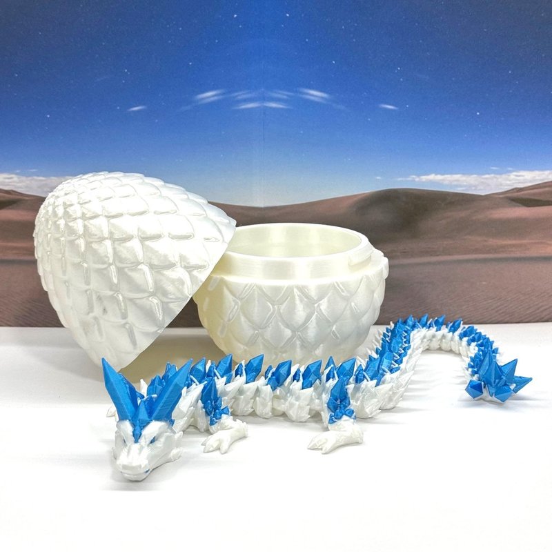 3D Printed enchanting Articulated Crystal Dragon - a mystical creature that brings a touch of fantasy to your world. Unveil the mystery of the Satin Scaled Dragon Egg and this White and Pink Crystal Dragon ( measures 12.5" long) a captivating fusion of elegance and fantasy. Encased within a meticulously designed crystal egg, this dragon reveals itself with a symphony of colors - a testament to its magical heritage. ------- Small Components Advisory: ------- Please note that this product may contain small components and might not be suitable for very young children. Given the characteristics of 3D printing, there is a potential for small components to detach if handled aggressively or dropped. Therefore, we advise against allowing younger children to interact with the dragon. Please consider that 3D printed objects might include minor imperfections such as layer lines. These are a natural and inherent aspect of the printing process. We strive to produce the highest quality items, and these imperfections contribute to the unique character of each piece. Recall the unique creation of each dragon, crafted exclusively for you. The color selections available are depicted in the provided photos. Please be aware that variations in color may occur due to discrepancies in filament production and the characteristics of the monitor or screen you are utilizing to view the listing. Additionally, the arrangement of prints using multi-colored filament rolls can influence color distribution. ------- Licensing Information: ------- Authorized Design: NOHo3D holds the official authorization for the production of this exquisite design created by CinderWing3D.