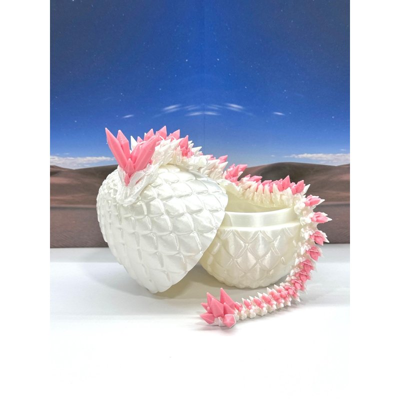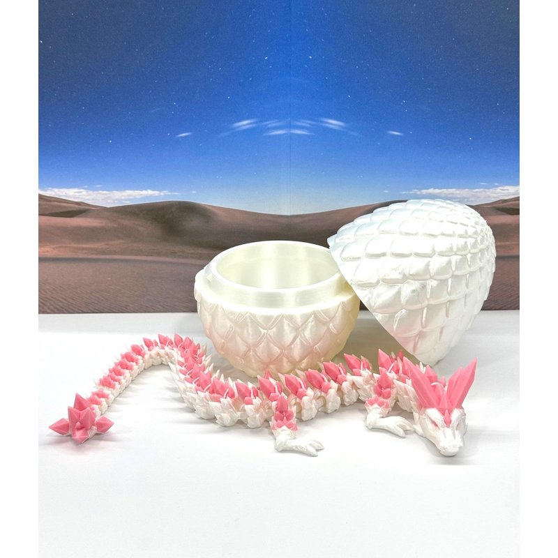 3D Printed enchanting Articulated Crystal Dragon - a mystical creature that brings a touch of fantasy to your world. Unveil the mystery of the Satin Scaled Dragon Egg and this White and Pink Crystal Dragon ( measures 12.5" long) a captivating fusion of elegance and fantasy. Encased within a meticulously designed crystal egg, this dragon reveals itself with a symphony of colors - a testament to its magical heritage. ------- Small Components Advisory: ------- Please note that this product may contain small components and might not be suitable for very young children. Given the characteristics of 3D printing, there is a potential for small components to detach if handled aggressively or dropped. Therefore, we advise against allowing younger children to interact with the dragon. Please consider that 3D printed objects might include minor imperfections such as layer lines. These are a natural and inherent aspect of the printing process. We strive to produce the highest quality items, and these imperfections contribute to the unique character of each piece. Recall the unique creation of each dragon, crafted exclusively for you. The color selections available are depicted in the provided photos. Please be aware that variations in color may occur due to discrepancies in filament production and the characteristics of the monitor or screen you are utilizing to view the listing. Additionally, the arrangement of prints using multi-colored filament rolls can influence color distribution. ------- Licensing Information: ------- Authorized Design: NOHo3D holds the official authorization for the production of this exquisite design created by CinderWing3D.