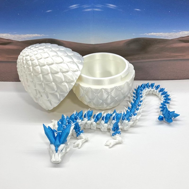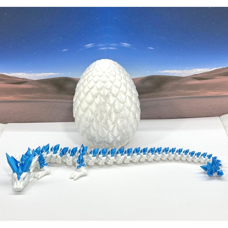 3D Printed enchanting Articulated Crystal Dragon - a mystical creature that brings a touch of fantasy to your world. Unveil the mystery of the Dragon Egg and this White AND Blue Crystal Dragon ( measures approximately 12.5" long) a captivating fusion of elegance and fantasy. Encased within a meticulously designed egg, this dragon reveals itself with a symphony of colors - a testament to its magical heritage. ------- Small Components Advisory: ------- Please note that this product may contain small components and might not be suitable for very young children. Given the characteristics of 3D printing, there is a potential for small components to detach if handled aggressively or dropped. Therefore, we advise against allowing younger children to interact with the dragon. Please consider that 3D printed objects might include minor imperfections such as layer lines. These are a natural and inherent aspect of the printing process. We strive to produce the highest quality items, and these imperfections contribute to the unique character of each piece. Recall the unique creation of each dragon, crafted exclusively for you. The color selections available are depicted in the provided photos. Please be aware that variations in color may occur due to discrepancies in filament production and the characteristics of the monitor or screen you are utilizing to view the listing. Additionally, the arrangement of prints using multi-colored filament rolls can influence color distribution. ------- Licensing Information: ------- Authorized Design: NOHo3D holds the official authorization for the production of this exquisite design created by CinderWing3D.