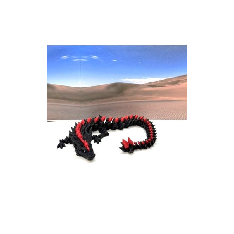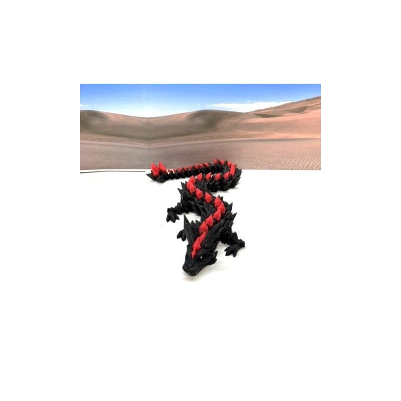3D Printed Articulated Black and Gold Crystal Dragon - a mystical creature that brings a touch of fantasy to your world. Unveil the mystery of this Night Sky Black and Red Crystal Dragon ( measures 12" long) a captivating fusion of elegance and fantasy. Encased within a meticulously designed crystal egg, this tiny dragon reveals itself with a symphony of colors - a testament to its magical heritage. ------- Small Components Advisory: ------- Please note that this product may contain small components and might not be suitable for very young children. Given the characteristics of 3D printing, there is a potential for small components to detach if handled aggressively or dropped. Therefore, we advise against allowing younger children to interact with the dragon. Please consider that 3D printed objects might include minor imperfections such as layer lines. These are a natural and inherent aspect of the printing process. We strive to produce the highest quality items, and these imperfections contribute to the unique character of each piece. Remember the unique creation of each dragon, crafted exclusively for you. The color selections available are depicted in the provided photos. Please be aware that variations in color may occur due to discrepancies in filament production and the characteristics of the monitor or screen you are utilizing to view the listing. Additionally, the arrangement of prints using multi-colored filament rolls can influence color distribution. ------- Licensing Information: ------- Authorized Design: NOHo3D holds the official authorization for the production of this exquisite design created by CinderWing3D.