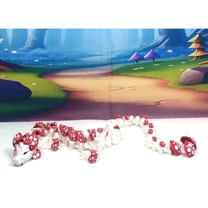 3D Printed enchanting Articulated Mushroom Dragon - a mystical creature that brings a touch of fantasy to your world. Unveil the mystery of this white AND red Mushroom Dragon ( measures approximately 12" long) a captivating fusion of elegance and fantasy. this dragon reveals itself with a symphony of colors - a testament to its magical heritage. ------- Choking Hazard Small Components Advisory NOT for Children under 3 years old: ------- Please note that this product may contain small components and might not be suitable for very young children. Given the characteristics of 3D printing, there is a potential for small components to detach if handled aggressively or dropped. Therefore, we advise against allowing younger children to interact with the dragon. Please consider that 3D printed objects might include minor imperfections such as layer lines. These are a natural and inherent aspect of the printing process. We strive to produce the highest quality items, and these imperfections contribute to the unique character of each piece. Recall the unique creation of each dragon, crafted exclusively for you. The color selections available are depicted in the provided photos. Please be aware that variations in color may occur due to discrepancies in filament production and the characteristics of the monitor or screen you are utilizing to view the listing. Additionally, the arrangement of prints using multi-colored filament rolls can influence color distribution. ------- Licensing Information: ------- Authorized Design: NOHo3D holds the official authorization for the production of this exquisite design created by CinderWing3D.