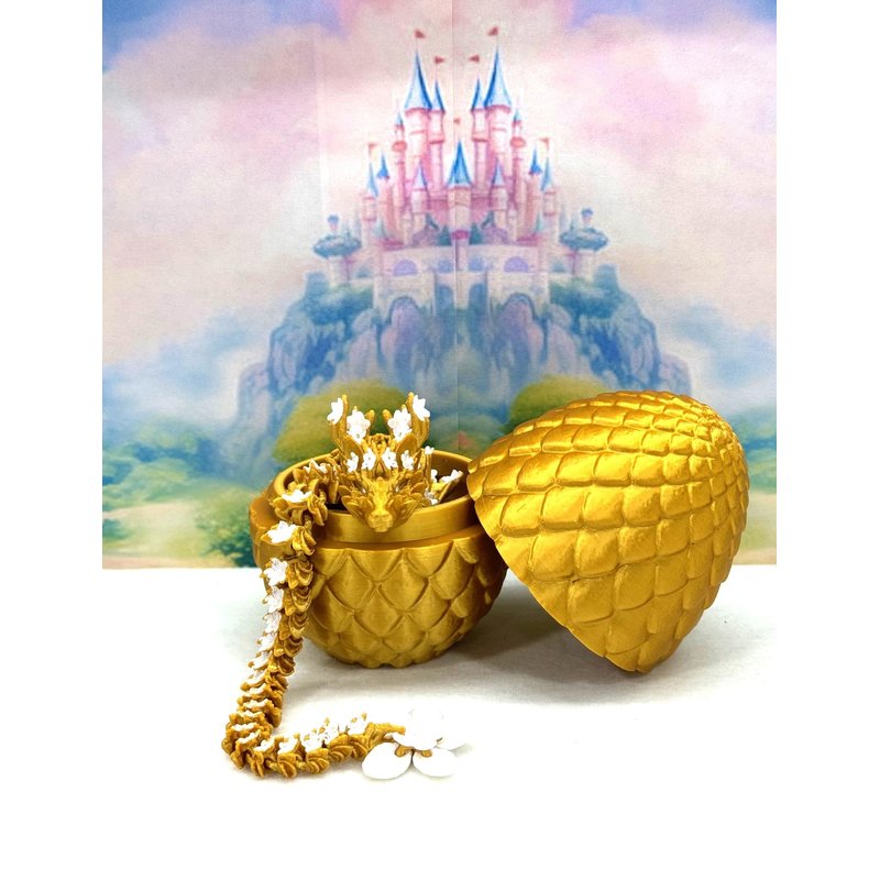 3D Printed enchanting Articulated Cherry Blossom Dragon - a mystical creature that brings a touch of fantasy to your world. Unveil the mystery of the Scaled silky GOLD Dragon Egg and this Gold and White Cherry Blossom Dragon ( measures 12" long) a captivating fusion of elegance and fantasy. Encased within a meticulously designed crystal egg, this tiny dragon reveals itself with a symphony of colors - a testament to its magical heritage. ------- Small Components Advisory: ------- Please note that this product may contain small components and might not be suitable for very young children. Given the characteristics of 3D printing, there is a potential for small components to detach if handled aggressively or dropped. Therefore, we advise against allowing younger children to interact with the dragon. Please consider that 3D printed objects might include minor imperfections such as layer lines. These are a natural and inherent aspect of the printing process. We strive to produce the highest quality items, and these imperfections contribute to the unique character of each piece. Recall the unique creation of each dragon, crafted exclusively for you. The color selections available are depicted in the provided photos. Please be aware that variations in color may occur due to discrepancies in filament production and the characteristics of the monitor or screen you are utilizing to view the listing. Additionally, the arrangement of prints using multi-colored filament rolls can influence color distribution. ------- Licensing Information: ------- Authorized Design: NOHo3D holds the official authorization for the production of this exquisite design created by CinderWing3D.