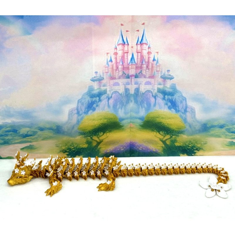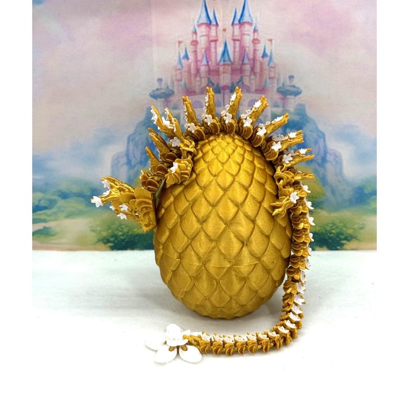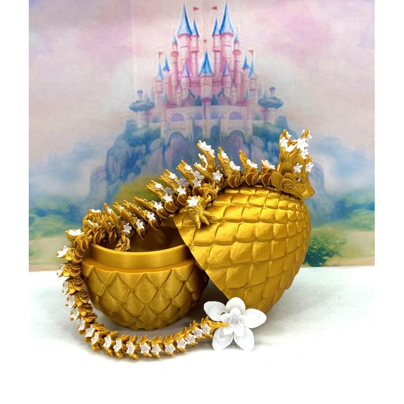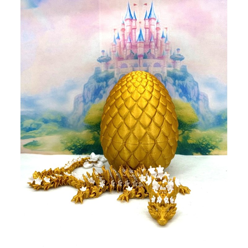 3D Printed enchanting Articulated Cherry Blossom Dragon - a mystical creature that brings a touch of fantasy to your world. Unveil the mystery of the Dragon Egg and this Gold and White Cherry Blossom Dragon ( measures approximately 12" long) a captivating fusion of elegance and fantasy. Encased within a meticulously designed GOLDEN crystal egg, this tiny dragon reveals itself with a symphony of colors - a testament to its magical heritage. ------- Choking Hazard Small Components Advisory NOT for Children under 3 years old: ------- Please note that this product may contain small components and might not be suitable for very young children. Given the characteristics of 3D printing, there is a potential for small components to detach if handled aggressively or dropped. Therefore, we advise against allowing younger children to interact with the dragon. Please consider that 3D printed objects might include minor imperfections such as layer lines. These are a natural and inherent aspect of the printing process. We strive to produce the highest quality items, and these imperfections contribute to the unique character of each piece. Recall the unique creation of each dragon, crafted exclusively for you. The color selections available are depicted in the provided photos. Please be aware that variations in color may occur due to discrepancies in filament production and the characteristics of the monitor or screen you are utilizing to view the listing. Additionally, the arrangement of prints using multi-colored filament rolls can influence color distribution. ------- Licensing Information: ------- Authorized Design: NOHo3D holds the official authorization for the production of this exquisite design created by CinderWing3D.