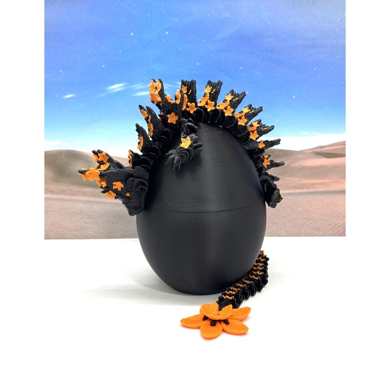 3D Printed enchanting Articulated Cherry Blossom Dragon - a mystical creature that brings a touch of fantasy to your world. Unveil the mystery of the Scaled Dragon Egg and this Black and Orange Cherry Blossom Dragon ( measures 12" long) a captivating fusion of elegance and fantasy. Encased within a meticulously designed crystal egg, this awesome dragon reveals itself with a symphony of colors - a testament to its magical heritage. ------- Small Components Advisory: ------- Please note that this product may contain small components and might not be suitable for very young children. Given the characteristics of 3D printing, there is a potential for small components to detach if handled aggressively or dropped. Therefore, we advise against allowing younger children to interact with the dragon. Please consider that 3D printed objects might include minor imperfections such as layer lines. These are a natural and inherent aspect of the printing process. We strive to produce the highest quality items, and these imperfections contribute to the unique character of each piece. Recall the unique creation of each dragon, crafted exclusively for you. The color selections available are depicted in the provided photos. Please be aware that variations in color may occur due to discrepancies in filament production and the characteristics of the monitor or screen you are utilizing to view the listing. Additionally, the arrangement of prints using multi-colored filament rolls can influence color distribution. ------- Licensing Information: ------- Authorized Design: NOHo3D holds the official authorization for the production of this exquisite design created by CinderWing3D.