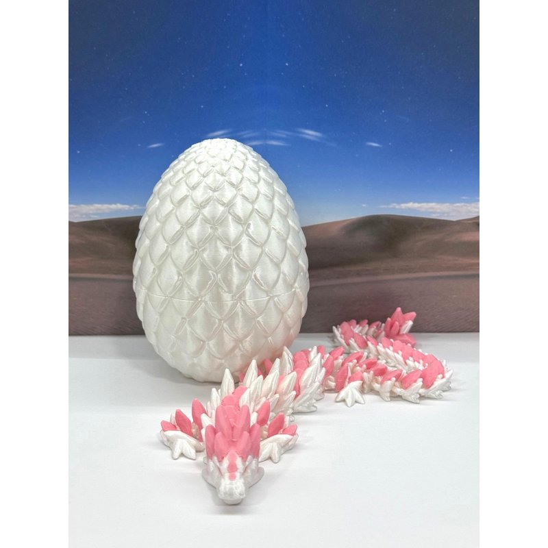3D Printed enchanting Mother and child Articulated Gemstone Dragon - a mystical creature that brings a touch of fantasy to your world. Unveil the mystery of the Dragon Egg and this White and Pink Gemstone Dragon ( Mother Dragon measures 12.5" long and the baby dragon is 6 inches long) a captivating fusion of elegance and fantasy. Encased within a meticulously designed crystal egg, this tiny dragon reveals itself with a symphony of colors - a testament to its magical heritage. ------- Small Components Advisory: ------- Please note that this product may contain small components and might not be suitable for very young children. Given the characteristics of 3D printing, there is a potential for small components to detach if handled aggressively or dropped. Therefore, we advise against allowing younger children to interact with the dragon. Please consider that 3D printed objects might include minor imperfections such as layer lines. These are a natural and inherent aspect of the printing process. We strive to produce the highest quality items, and these imperfections contribute to the unique character of each piece. Recall the unique creation of each dragon, crafted exclusively for you. The color selections available are depicted in the provided photos. Please be aware that variations in color may occur due to discrepancies in filament production and the characteristics of the monitor or screen you are utilizing to view the listing. Additionally, the arrangement of prints using multi-colored filament rolls can influence color distribution. ------- Licensing Information: ------- Authorized Design: NOHo3D holds the official authorization for the production of this exquisite design created by CinderWing3D.