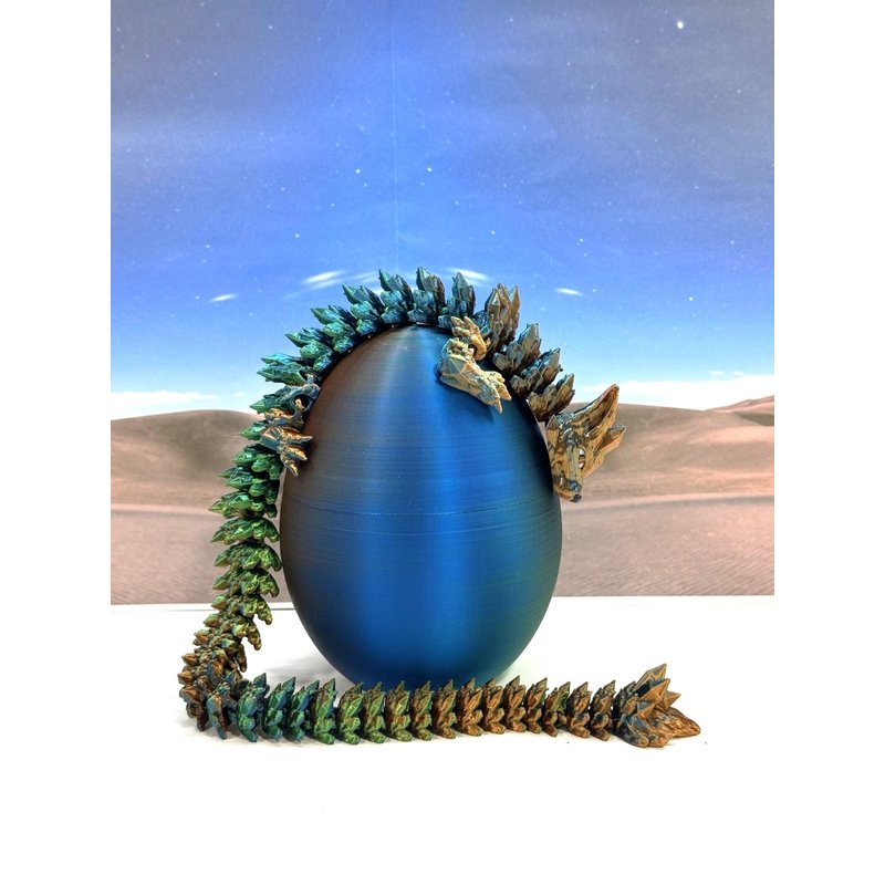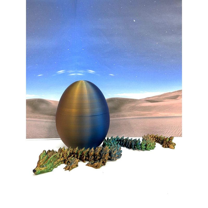 3D Printed enchanting Articulated WOLF Dragon - a mystical creature that brings a touch of fantasy to your world. Unveil the mystery of the Dragon Egg and this tri color-Orange Blue Green WOLF Dragon ( measures approximately 12" long) a captivating fusion of elegance and fantasy. Encased within a CLASSIC egg, this tiny dragon reveals itself with a symphony of colors - a testament to its magical heritage. ------- Small Components Advisory: ------- Please note that this product may contain small components and might not be suitable for very young children. Given the characteristics of 3D printing, there is a potential for small components to detach if handled aggressively or dropped. Therefore, we advise against allowing younger children to interact with the dragon. Please consider that 3D printed objects might include minor imperfections such as layer lines. These are a natural and inherent aspect of the printing process. We strive to produce the highest quality items, and these imperfections contribute to the unique character of each piece. Recall the unique creation of each dragon, crafted exclusively for you. Authorized Design: NOHo3D holds the official authorization for the production of this exquisite design created by CinderWing3D.