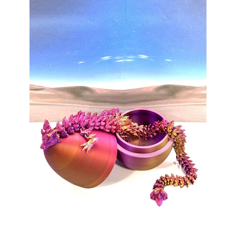 3D Printed enchanting Articulated WOLF Dragon - a mystical creature that brings a touch of fantasy to your world. Unveil the mystery of the Dragon Egg and this tri color-Red Purple Gold WOLF Dragon ( measures approximately 12" long) a captivating fusion of elegance and fantasy. Encased within a CLASSIC egg, this tiny dragon reveals itself with a symphony of colors - a testament to its magical heritage. ------- Small Components Advisory: ------- Please note that this product may contain small components and might not be suitable for very young children. Given the characteristics of 3D printing, there is a potential for small components to detach if handled aggressively or dropped. Therefore, we advise against allowing younger children to interact with the dragon. Please consider that 3D printed objects might include minor imperfections such as layer lines. These are a natural and inherent aspect of the printing process. We strive to produce the highest quality items, and these imperfections contribute to the unique character of each piece. Recall the unique creation of each dragon, crafted exclusively for you. Authorized Design: NOHo3D holds the official authorization for the production of this exquisite design created by CinderWing3D.